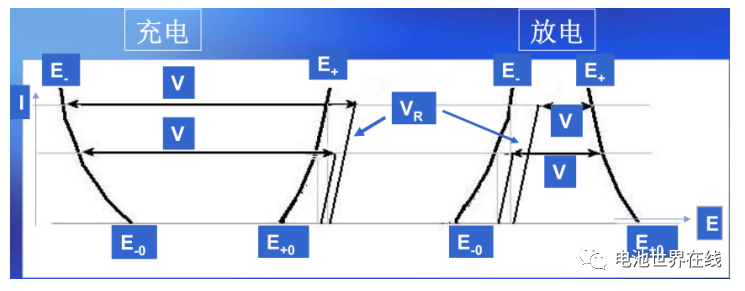 放电:VD = (E+ - E-)- VR =(E+0-η+)- (E-0 + η-)- VR